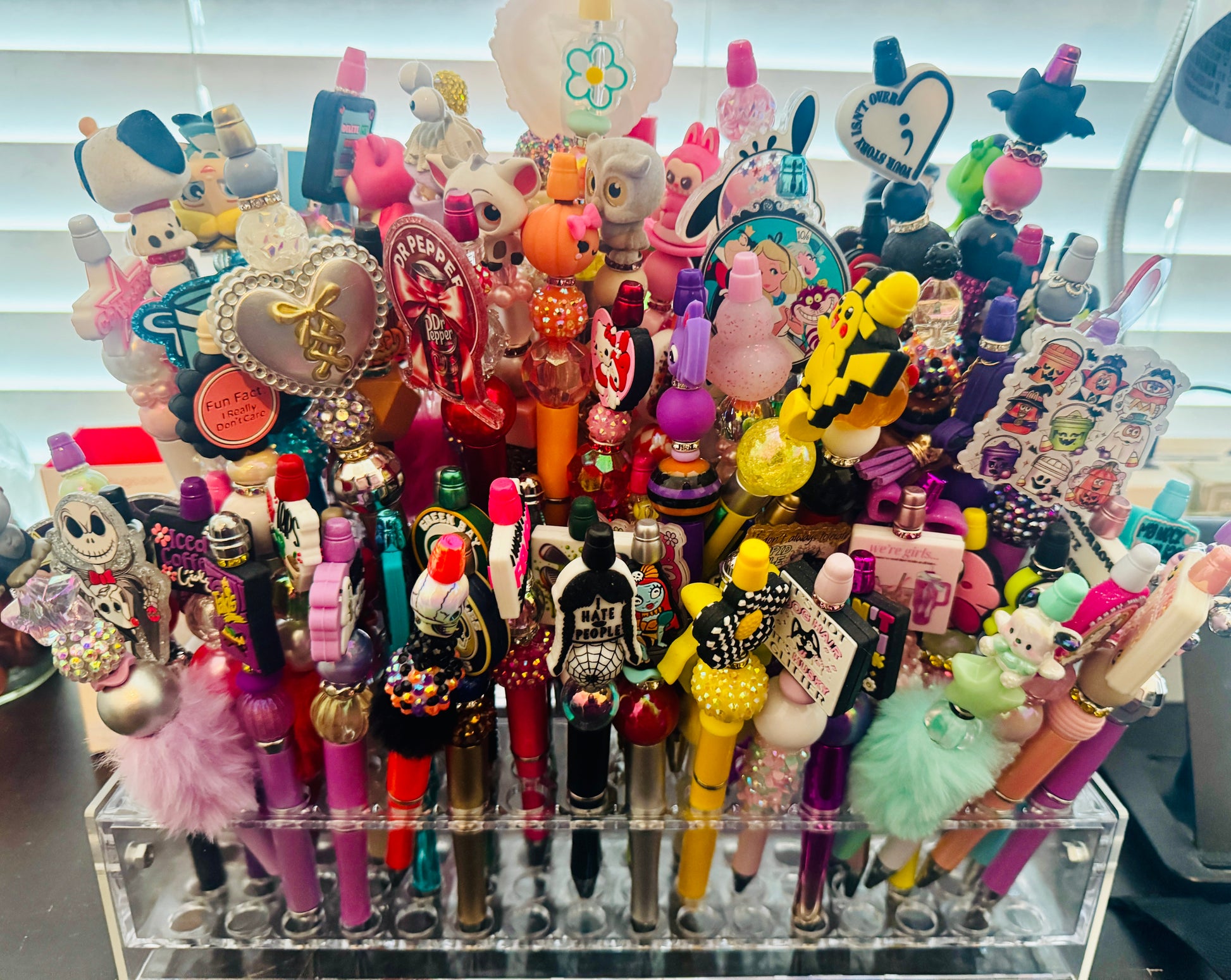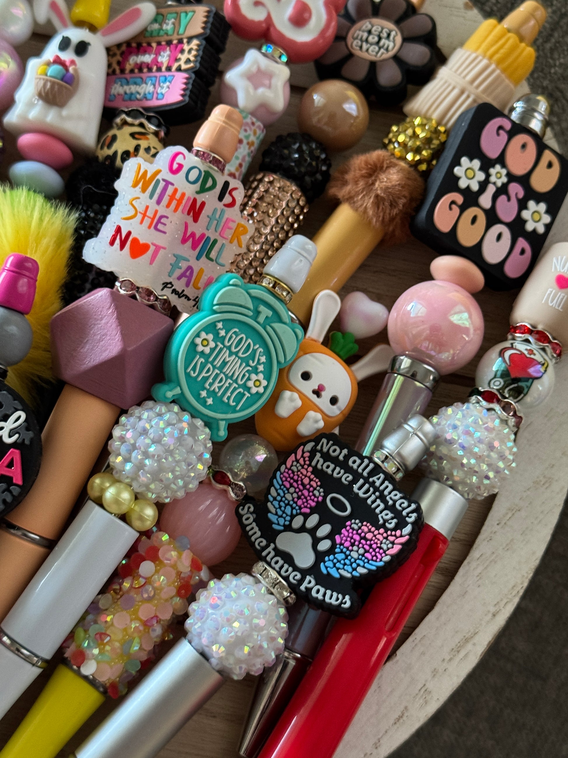 ✔️ A mix of character, glitter, beaded, fuzzy, resin, or themed pens